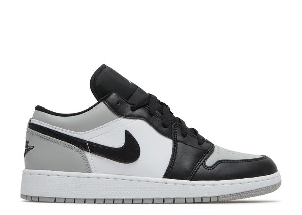 The Air Jordan 1 Low Shadow Toe (GS) for grade schoolers has a color scheme composed of different shades of black, white, and grey. The sole is a bright white with a thin stripe of grey at the very bottom. The upper part of the shoe is made of different pieces of leather, and the Nike swoosh symbol appears in black on the side.
