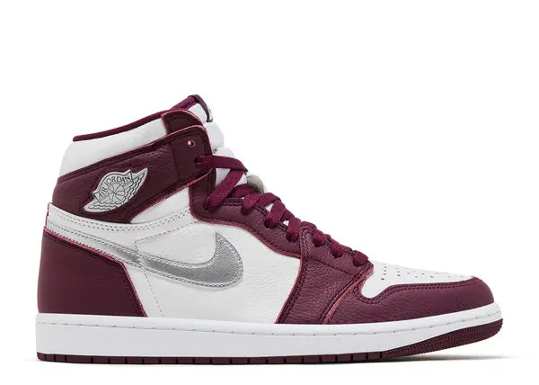 The Air Jordan 1 Retro High OG ‘Bordeaux’ dresses the archetypal silhouette in a white leather upper with vinous leather overlays at the forefoot, heel and collar. Similar to the CO.JP ‘Midnight Navy’ colorway, the sneaker is accented with a metallic silver Swoosh and a jeweled Wings logo on the lateral ankle. A woven Nike Air tongue tag atop the lightly padded nylon tongue delivers an OG touch. A traditional two-tone AJ1 cupsole packs encapsulated Nike Air cushioning under the heel.
