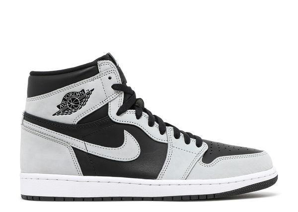 The upper of the Air Jordan 1 Shadow 2.0 is made of a black leather base with Light Smoke Grey overlays. A classic Wings logo appears on the lateral ankle wrap while a woven Nike Air label is stitched atop the tongue to complete the look.