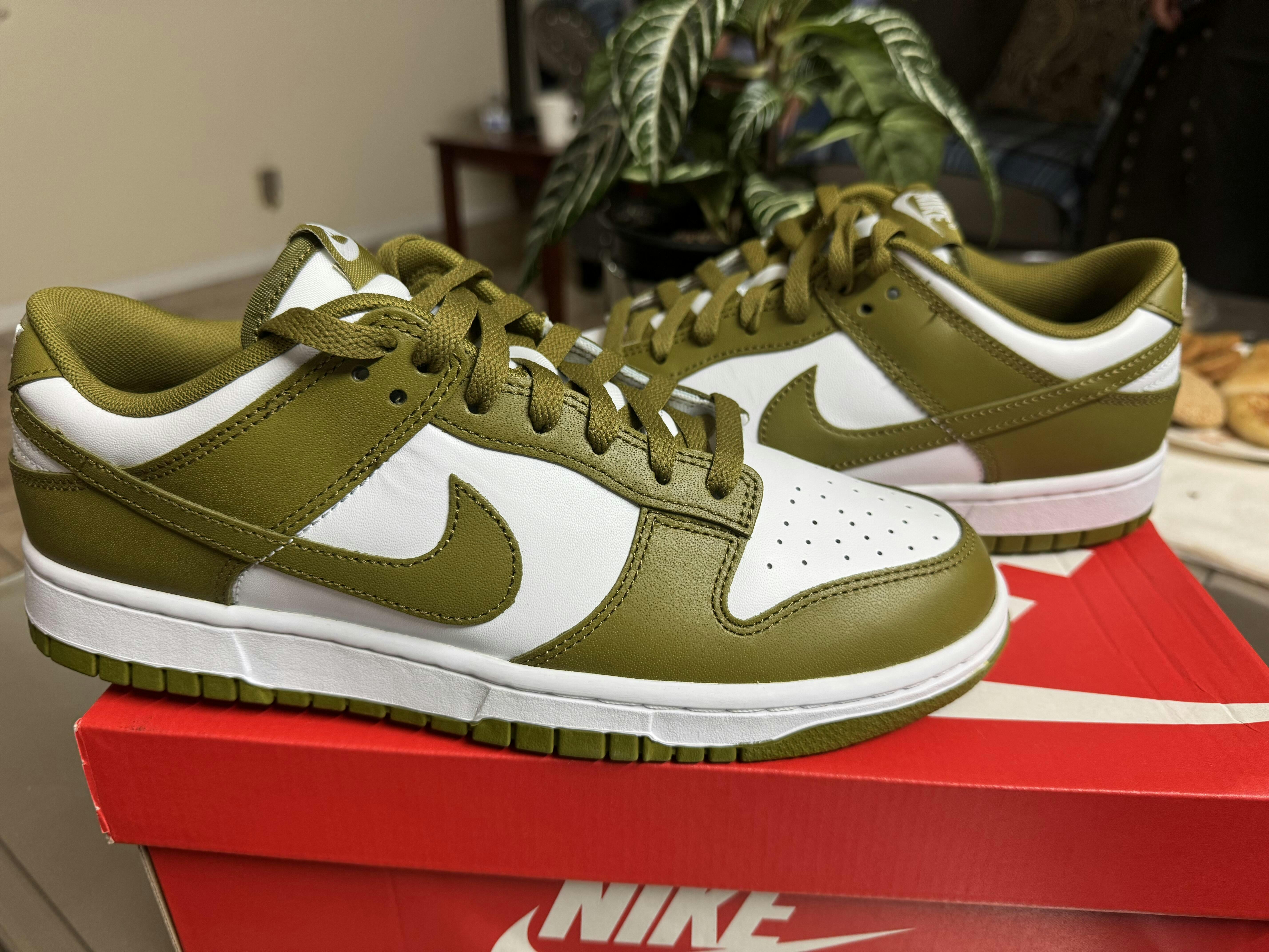 The Nike Dunk Low 'Pacific Moss' carries a traditional leather upper, featuring a stark white foundation with neutral olive overlays and a color-matched Swoosh. Nike branding appears on the tongue tag, sockliner and back tab. Anchoring the sneaker is a rubber cupsole that nods to the shoe's college basketball roots, highlighted by an outsole traction pattern with a pivot circle under the forefoot.