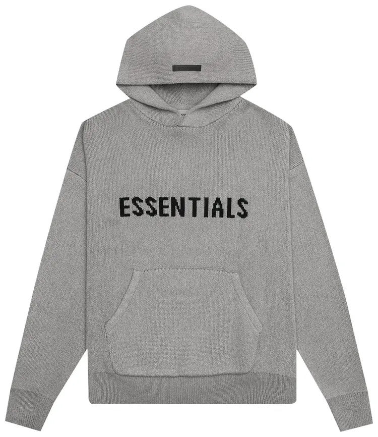 Most parts of the Fear of God Essentials Knit Pullover Hoodie feature a one-piece design. These include the raglan sleeves with a ribbed cuff, ensuring a commendable fit and durable finish. Further, the hood features no seams but is embellished by a black rubber patch with embossed Essentials branding in block letters. The body of this hoodie is designed for comfort, with slightly dropped shoulders. The Essentials name is woven into the fabric on the chest in a contrasting black color and blurred outlines. Above the ribbed hem is a kangaroo pocket with a skewed hexagonal shape.