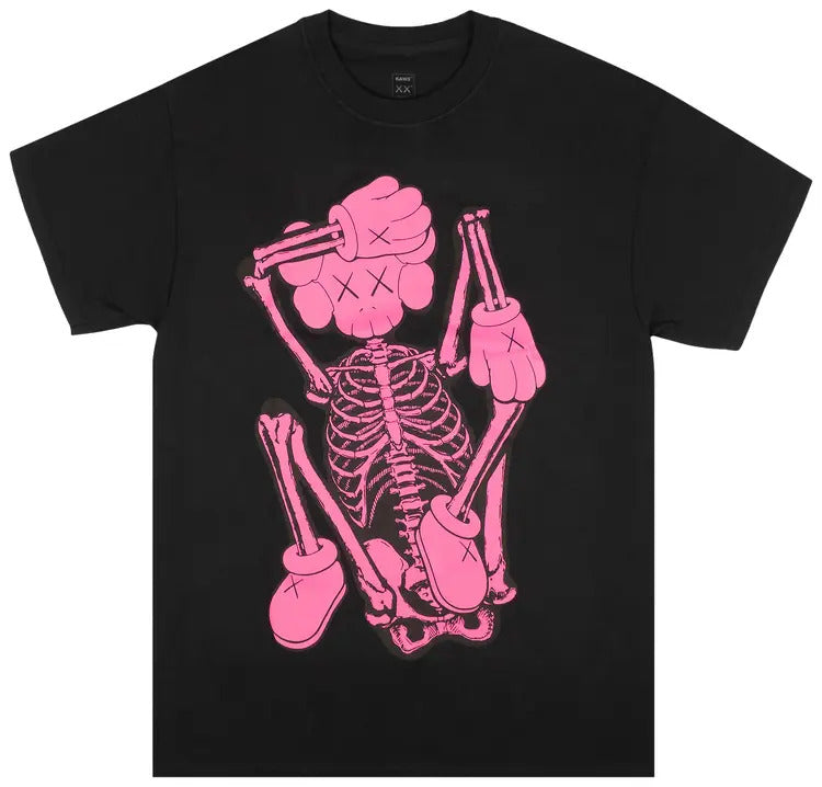 The KAWS Skeleton New Fiction Bone T-Shirt 'Black' is named after the artist's first major solo exhibition in London. It's printed with a pink skeletal Companion figure that shares a similar form with the works presented in the exhibit.
