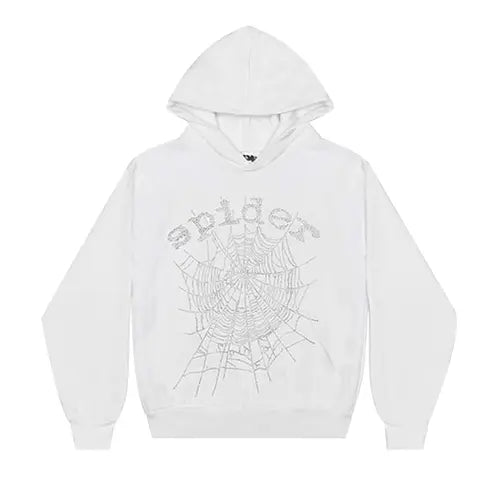 The Logo Hoodie in White by Sp5der OG comes in a distinct all-white color giving a 555 look, and is made from 100% cotton. The thick hoodie has a detailed 3D effect from silver rhinestone crystals with the word "spider" written at the top front and depicting a large cobweb. The front part comprises a silver Rhinestone pattern, front pockets, and ribbed hem and cuffs. This pullover comes in different sizes, from small to extra-large.