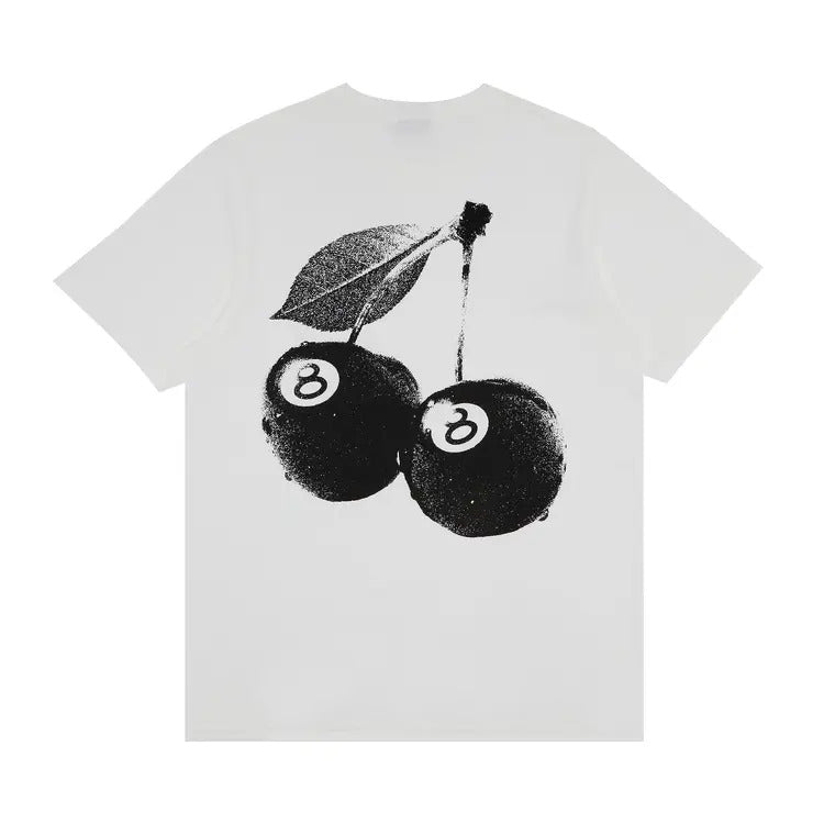 This version of the Stussy Cherries Tee comes in white, which dominates most of the design. On the front of the shirt, a small black Stussy logo can be seen on one side of the chest. On the back of the shirt, there is a large black graphic print of cherries on the stem, but the cherries themselves are in the form of 8 balls from billiards. The unisex shirt is made of cotton and has a relaxed fit for maximum versatility and comfort.