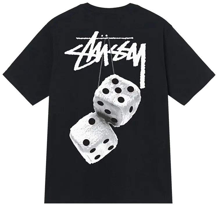 The Stussy Fuzzy Dice Black has a small white Stussy logo on the left chest. There’s a bigger Stussy logo on the tee’s upper back. Hanging on the logo as two white dice with black pips. The logo and dice are white to make them conspicuous on the black background. The shirt has a crew neck with a front neck drop. It has open sleeves.