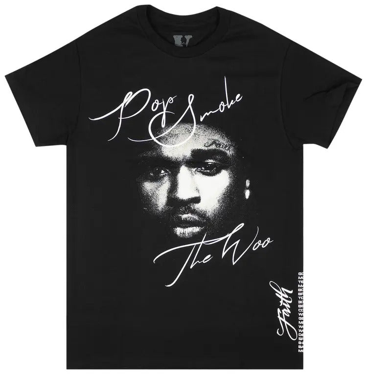 Made in collaboration with Pop Smoke, this Vlone Faith T-Shirt celebrates the rapper's 2021 album of the same name. Executed in black, the top is printed with artwork of the artist's face on the front and a flame iteration of Vlone's logo on the back.